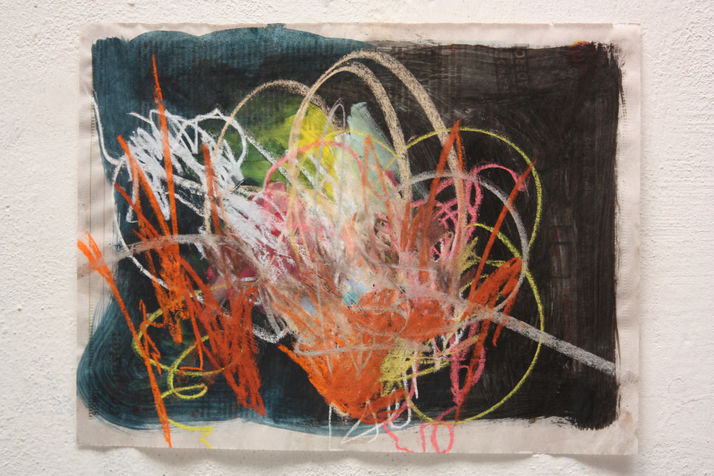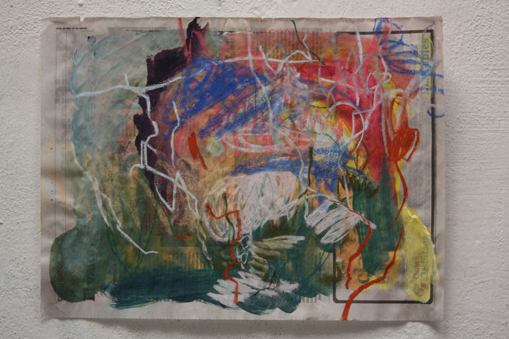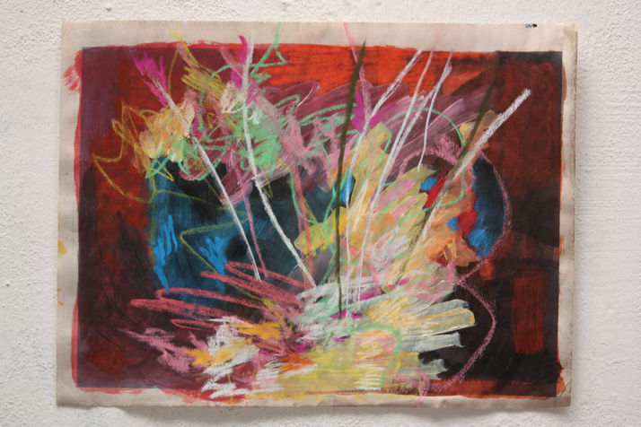 Así fue como surgió esta serie de pinturas ciegas. Luego de pintar un fondo de distintos colores con acrílicos, empezaba la etapa de tapar mis ojos con una venda y poner música de fondo. Los pasteles tiza me permitieron realizar trazos que acompañaban la música, sus ritmos e intensidades. La elección de los colores resultaba completamente aleatoria y resultaron algunas paletas extrañas y nuevas para mí.